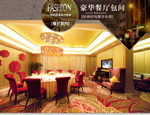 產(chǎn)品簡(jiǎn)介:酒店家具豪華餐廳包間,餐廳包間桌椅組合,專業(yè)定制各種豪華酒店家具,精裝豪宅家具等并提供裝飾設(shè)計(jì)。